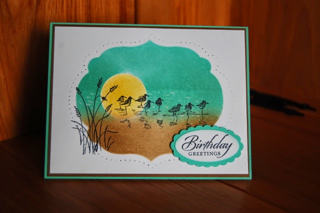 I have been personally challenging myself to create at least one masculine card at every stampers' club class, so this is what we made for my Sept class.  I have seen many cards made with the Wetlands stamp set, and just love this stamp of the birds on the beach.  I wanted to show case reverse masking, and regular masking, and also the piercing templates and paper piercer that I have not show cased nearly enough.