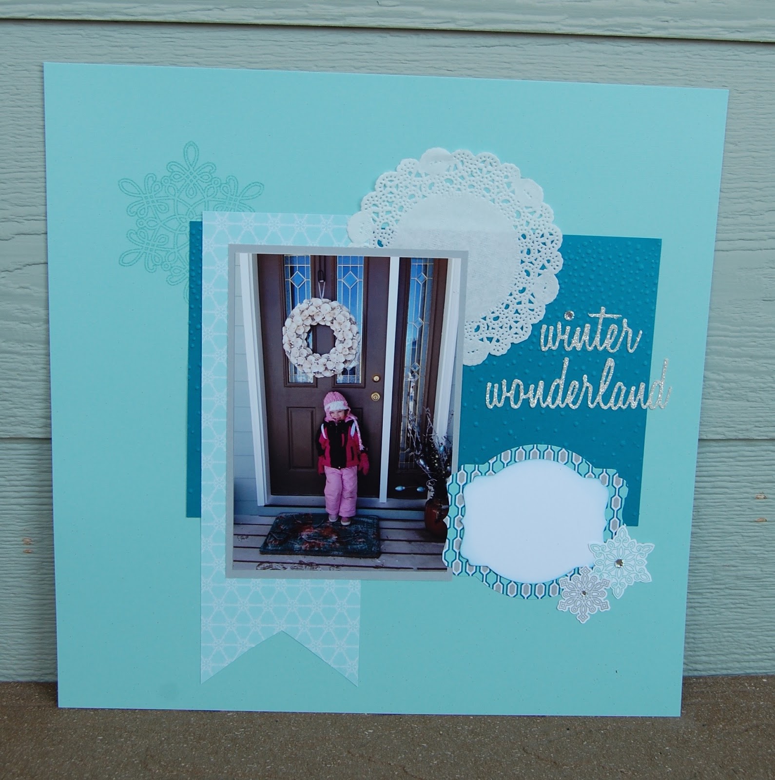 I was inspired to create this layout from a similar one I saw on Pinterest. I loved the grid look on the second page, and wanted to do a winter layout for the class. I had these word dies that say "winter wonderland" and thought they looked so gorgeous in the silver glimmer paper. I also wanted to show case the new Flurry of Wishes bundle from the Holiday catalog -- a gorgeous snow flake stamp set and matching punch. I layered the middle snow flake on top of a metalic foil doily. Such a pretty touch. The "snow, Brrr, and joy" words are from the snowflake card thinlet die that is on the clearance rack for a screamin' deal. Just sayin! Colors used: Pool Party, Smokey Slate, Whisper White, and silver glimmer paper.
